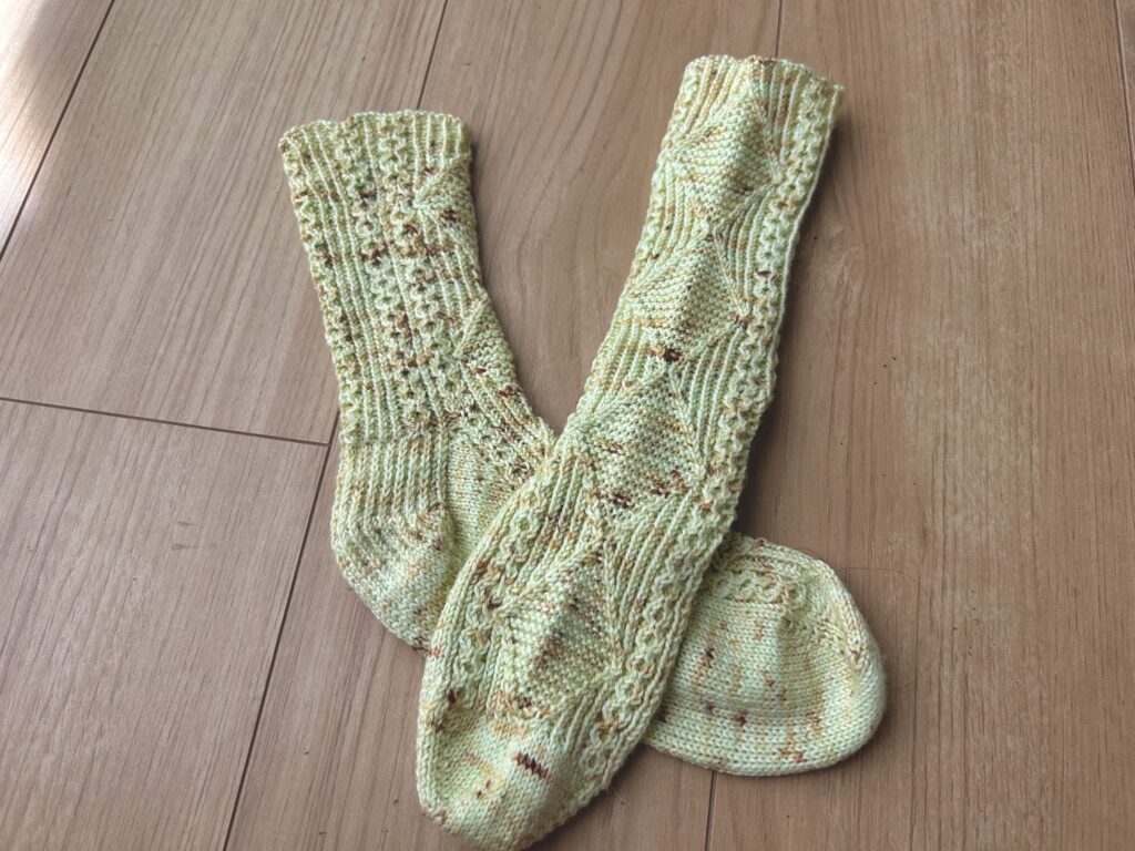 この靴下はつま先から編むパターンで、ゴム編みベースにダイヤ模様と交差模様を組み合わせて編んでいきます。最初はチャートと睨めっこしながらでしたが、慣れてくるとチャートをを見ずに編むことができました。