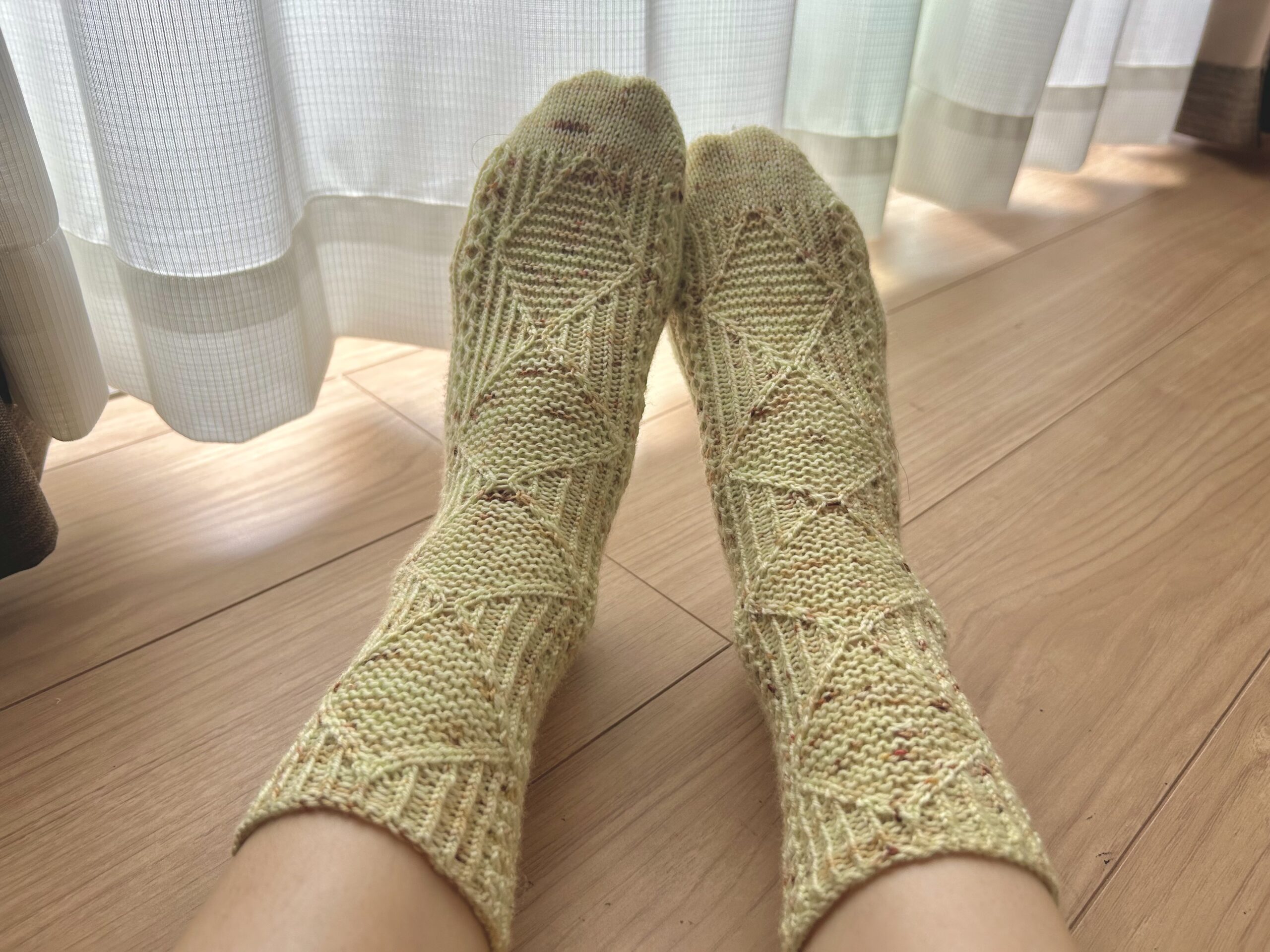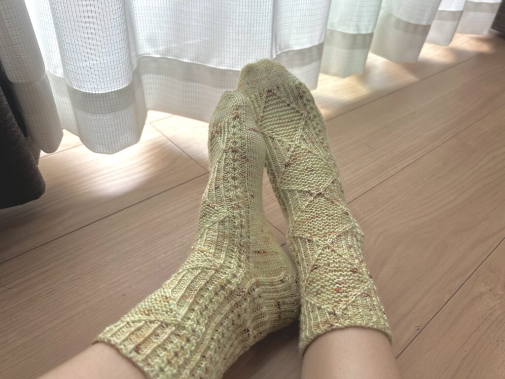 紆余曲折ありましたが、最終的にお気に入りの1足を編むことができました。初のドイツ式の踵はあみ終わってみると編み地も穴がなく綺麗でフィット感があり履き心地も良かったです。