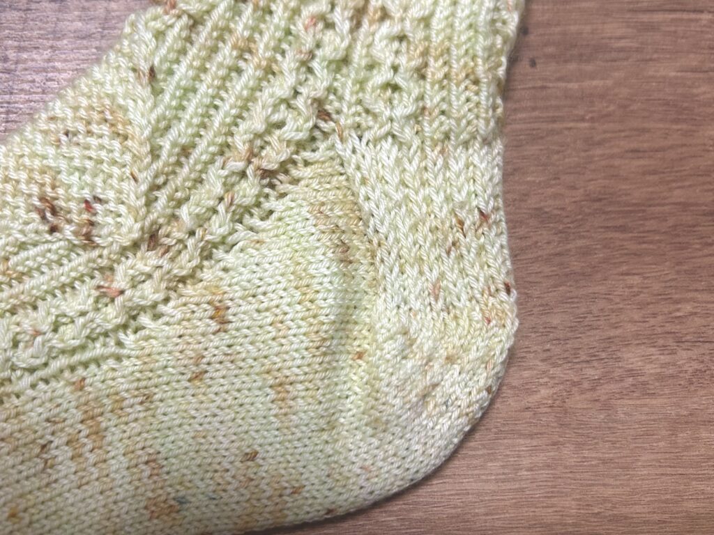 踵はドイツ式の編み方。この踵は初めて編むため、少し戸惑いましたが、慣れると編み方自体は簡単だと思いました。しかし、サイズ調整がうまくいかず片方完成した後に全て解いて編み直しました🥲ゲージはほぼ指定通りになったのですが、指定の足底の長さまで編んでから踵を編むと、小さく出来上がってしまいました。(踵だけきつく編んでしまったのか編み方が違うのか… 理由は不明🤔)