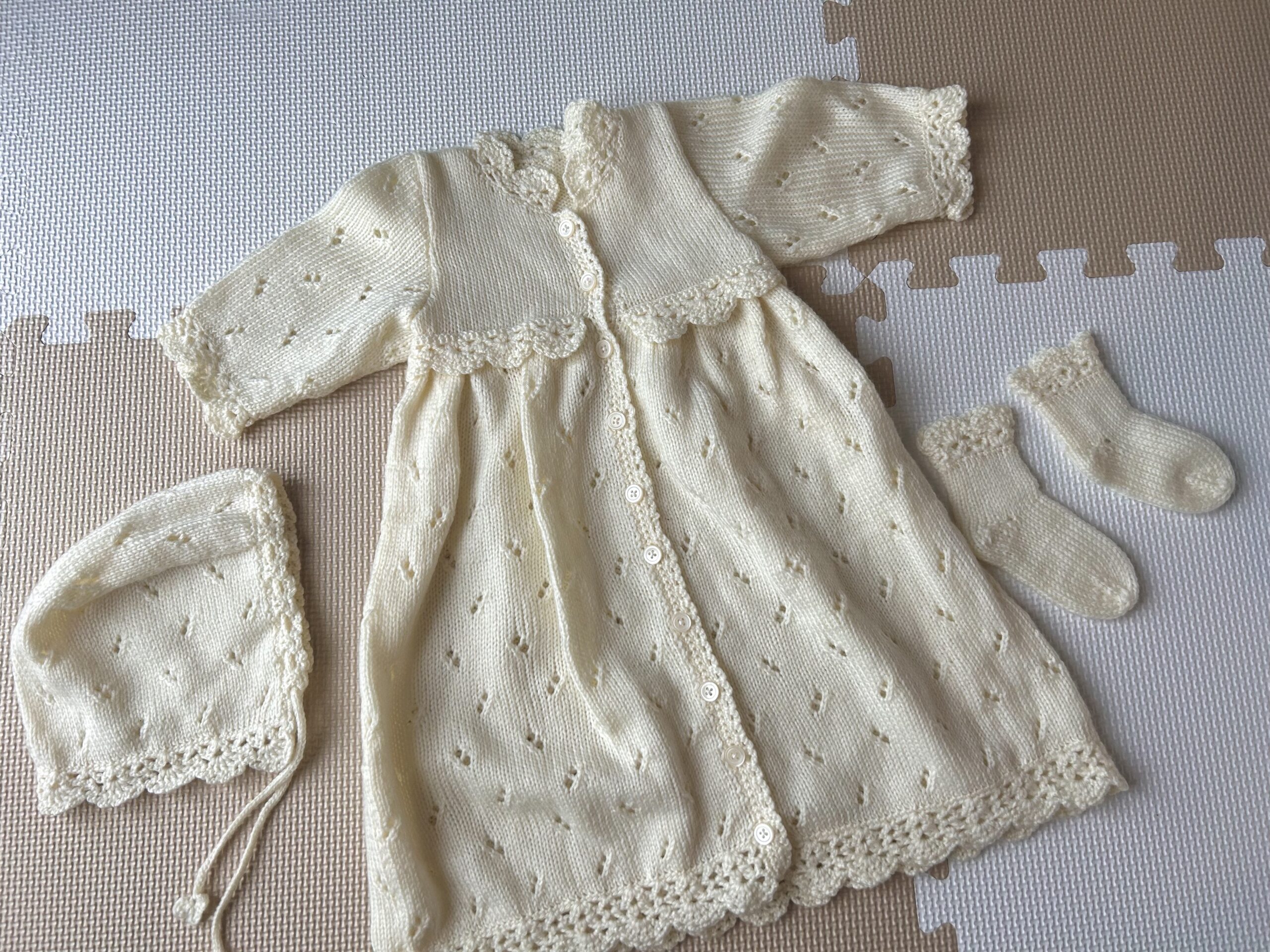 まずは完成品の紹介です。今回編んだのは3点、「セレモニードレス」、「靴下」、「ボンネット」です。