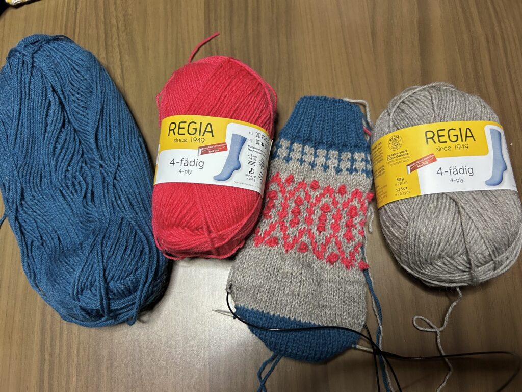 今回使用した毛糸はREGIA UNI 4ply(カラーは2070番と1057番)、alizeのArtisan(カラーは666番)の3つです。REGIAの毛糸は今回初めて使用しました。