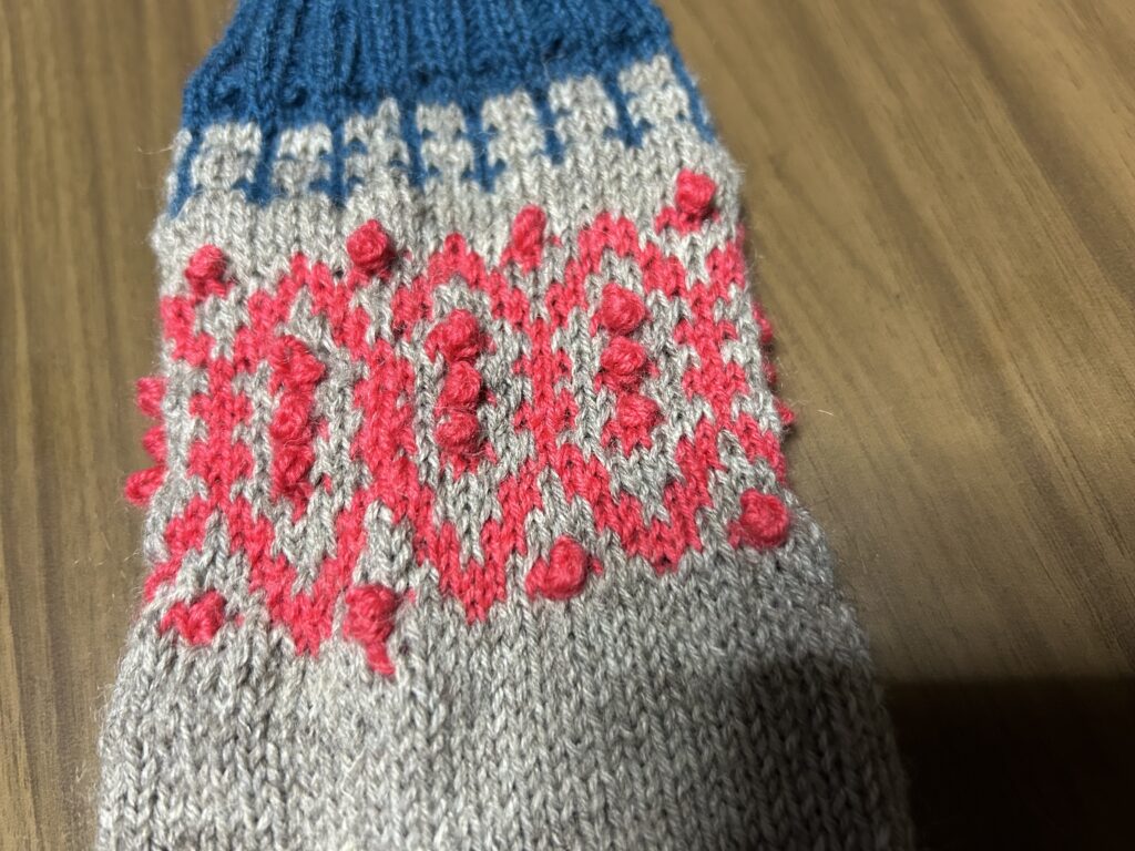 特に、こちらのパターンは編み込み模様に加えボップルもあり、上手に編むのが大変でした。しかし、徐々に模様が出てくるのが面白くて、最後まで楽しく編むことができました。