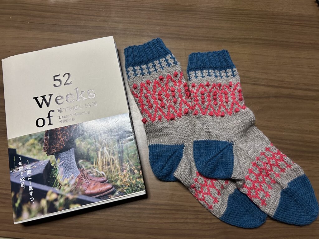 こちらは靴下を編む52週に掲載されているパターンで、Caitlin Hunterさんがデザインされたものです。Caitlin Hunterさんは編み込みのセーターや帽子などのデザインで人気が高いイメージがあります。私もいつかCaitlin Hunterさんの作品を編んでみたいと思っていたので、今回編むことができて嬉しいです。