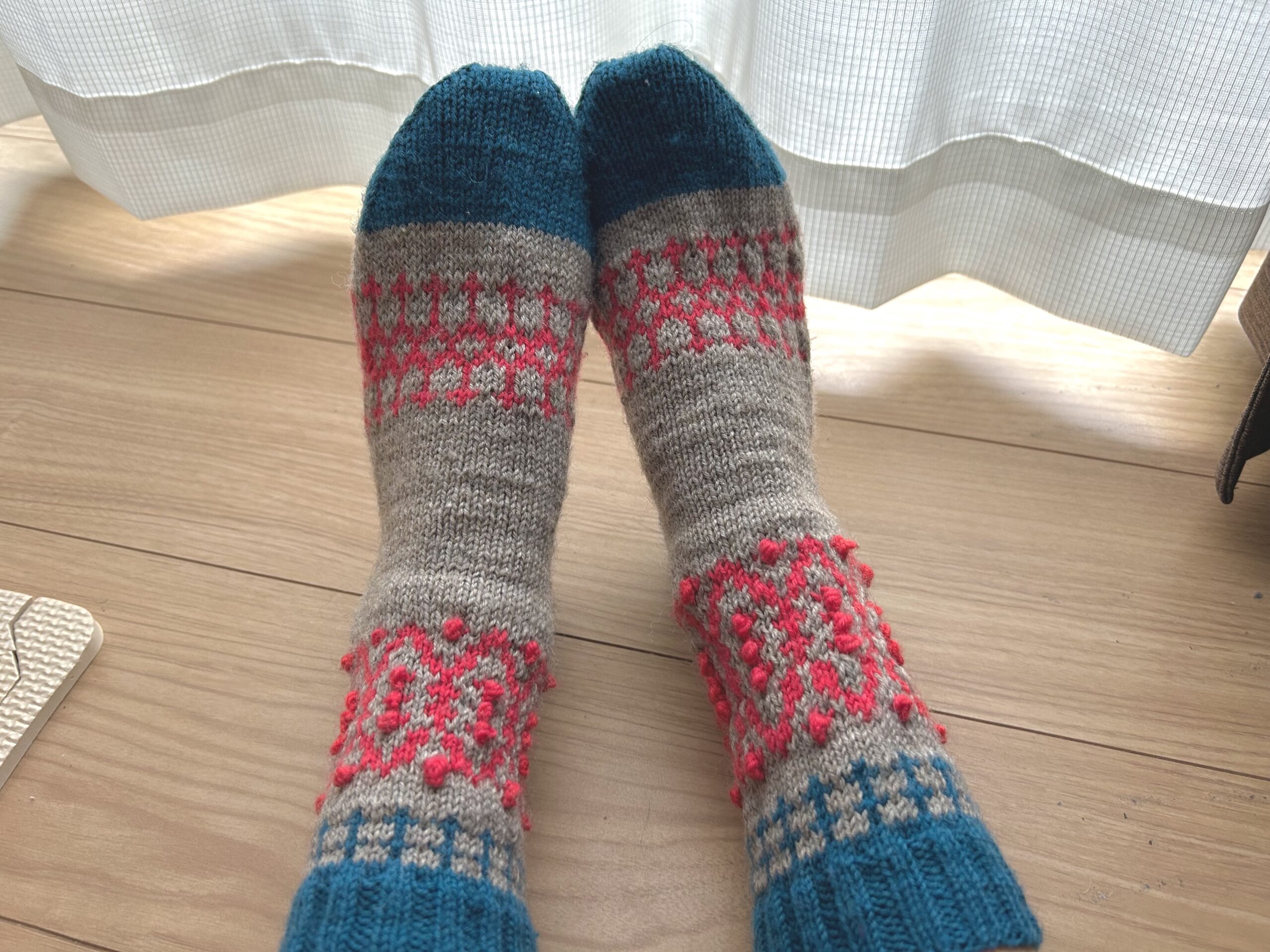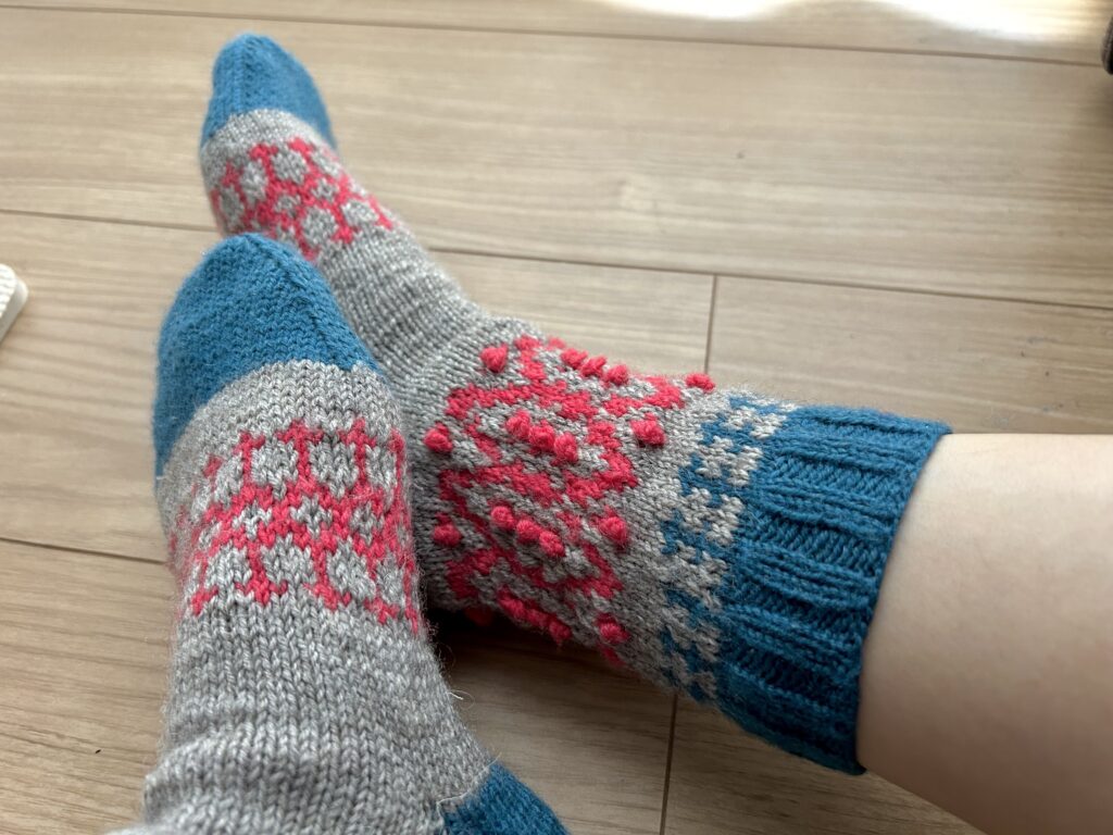 そして完成品はこちらです。しかし…よく見ると足首の模様編みの部分の長さが左右で全然違うのが分かりますか?(涙)