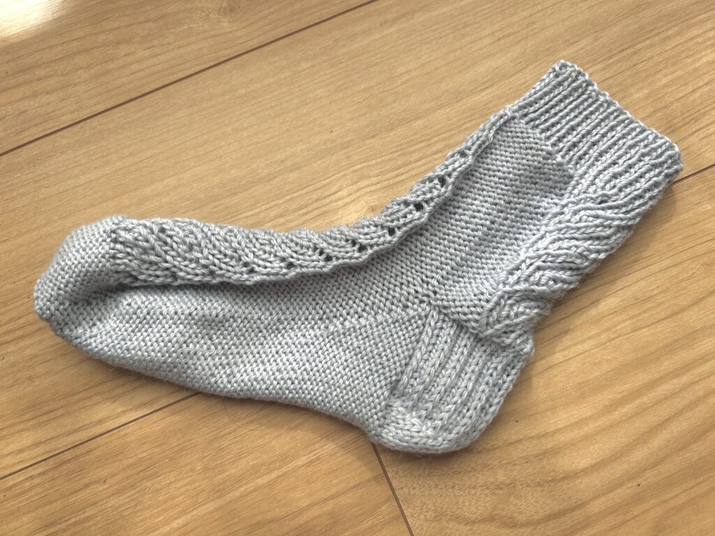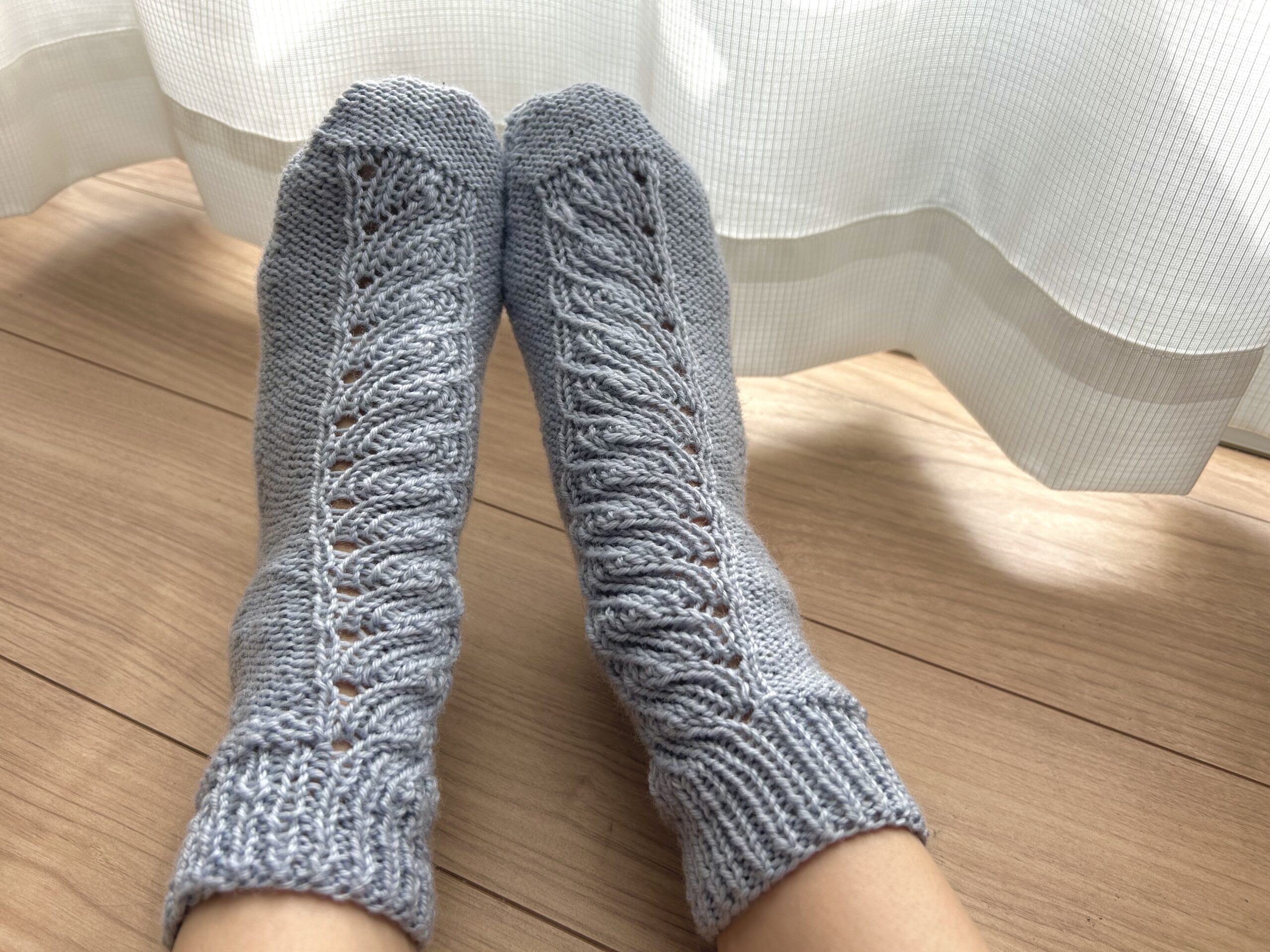記事の始めにも記載しましたが、こちらはDK Weight(並太)の糸で編むパターンです。針も指定は3.0mmと、一般的なFingeringの靴下のパターンよりも太い針でサクサクと編み進めることができました。裏メリヤスがメインで透かし編みの模様が入っています。特に難しいテクニックは必要なく、一般的な履き口から編む靴下と同じ編み方で編むことができます。ただし、メインの編み地が裏メリヤスのため、裏編みが苦手な方には編むのが大変なのではないかと思いました。