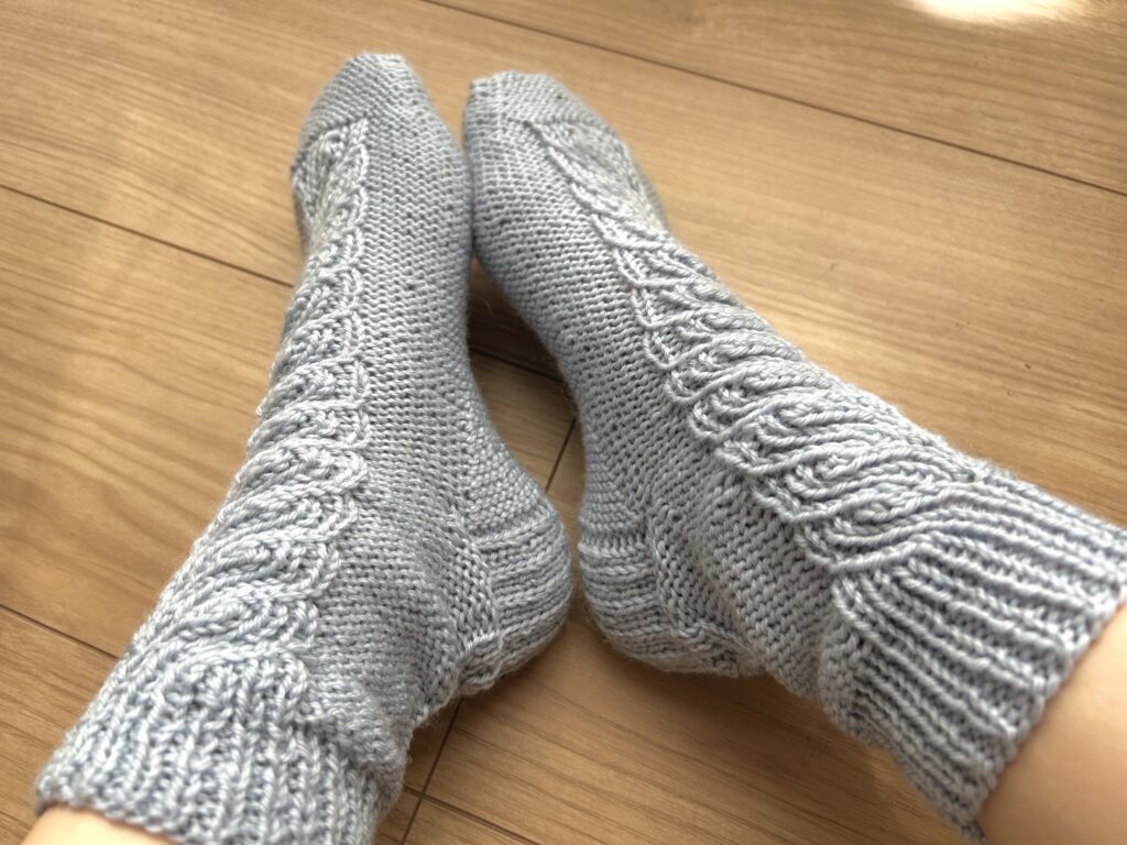 今回は久しぶりの並太の毛糸での靴下編みだったので、思いの外サクサクと進み、最後まで楽しく編むことができました。また、太い毛糸なので暖かく、寒い時期にも重宝する靴下になったのではないかと思います。
