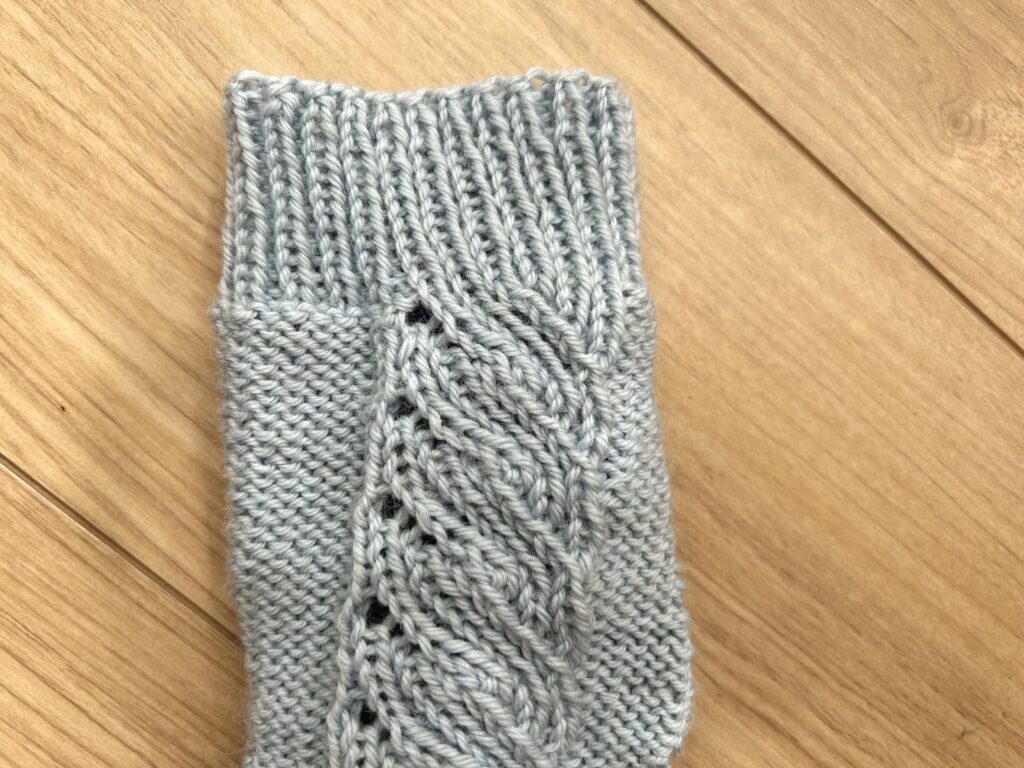実際に編んでみて、履き口のゴム編みと模様編みが繋がっている部分が美しくて、細かいところまで考えられるパターンだなと思いました。(下の写真参照:私の技術が追いついていないため、編み地があまり美しくありませんが😭)また、模様編みが左右対象となっていて片方で飽きることなく最後まで編むことができました。