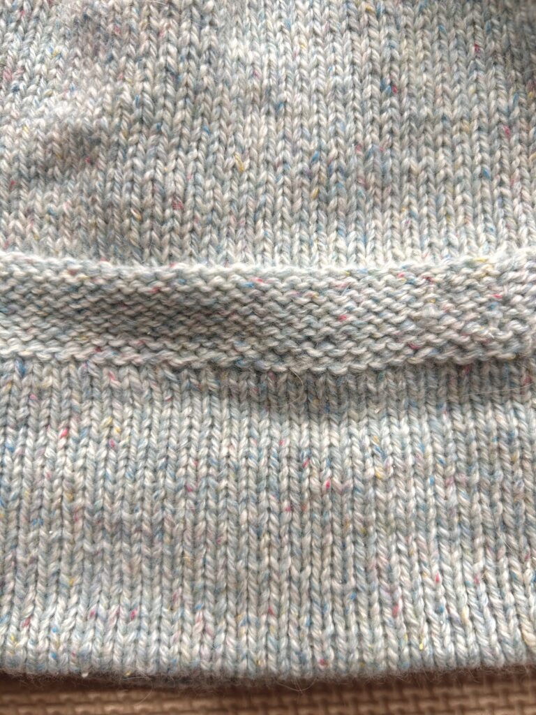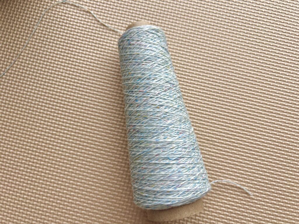 私が今回使用した毛糸は太陽毛糸さんの催事で購入したものです。番手は2/15で素材はウール70%、アンゴラ10%、シルク10%、ナイロン10%です。2本どりでJP5号の輪針を使用して編んでいます。水色ベースにピンクや黄色、濃いめの水色のネップが入っていて可愛らしい糸です。ゲージをとって水通しをしたらとても柔らかくなり肌触りも良かったので、赤ちゃん用の作品にも合うのではないかと思っています。
